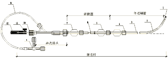 1.推送桿螺絲;2.推送桿;3.傳送鞘管;4.傳送鞘管座;5.裝載器頭端座;6.裝載器導管;7.裝載器尾端座;8.延長管;9.三通閥;10.止血閥;11.緊固螺絲;12.旋轉手柄