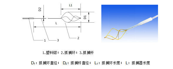 抓捕器是專門為經導管修補室間隔缺損設計的,由鎳鈦形狀記憶合金絲、304不銹鋼管及鍍金鎢絲套環組合而成。抓捕器的前端為一抓捕環,與抓捕環連接部分為組成圓環鋼絲的延續部分。